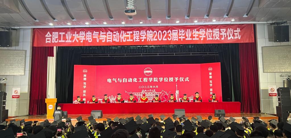 6月15日下午,电气与自动化工程学院2023届合肥校区毕业生学位授予仪式在屯溪路校区斛兵礼堂举行。校党委常委、副校长刘晓平出席仪式,学院相关负责人、学位评定委员会委员、教师代表以及2023届学士、硕士、博士学位获得者参加仪式。仪式由院党委副书记兼纪委书记李丽鹏主持。