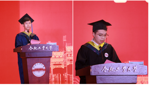 沈涵同学深情感恩母校的关心、包容和理解,希望同学们承“工业报国”之志,为国家建设添砖加瓦,为工大再添荣光,书写新一代工大人矢志报国、不懈奋斗的青春宣言。金致含同学与在场的全体毕业生共同回顾了在工大校园的美好回忆,向母校老师表达真挚感谢,向同学朋友献上美好祝福。