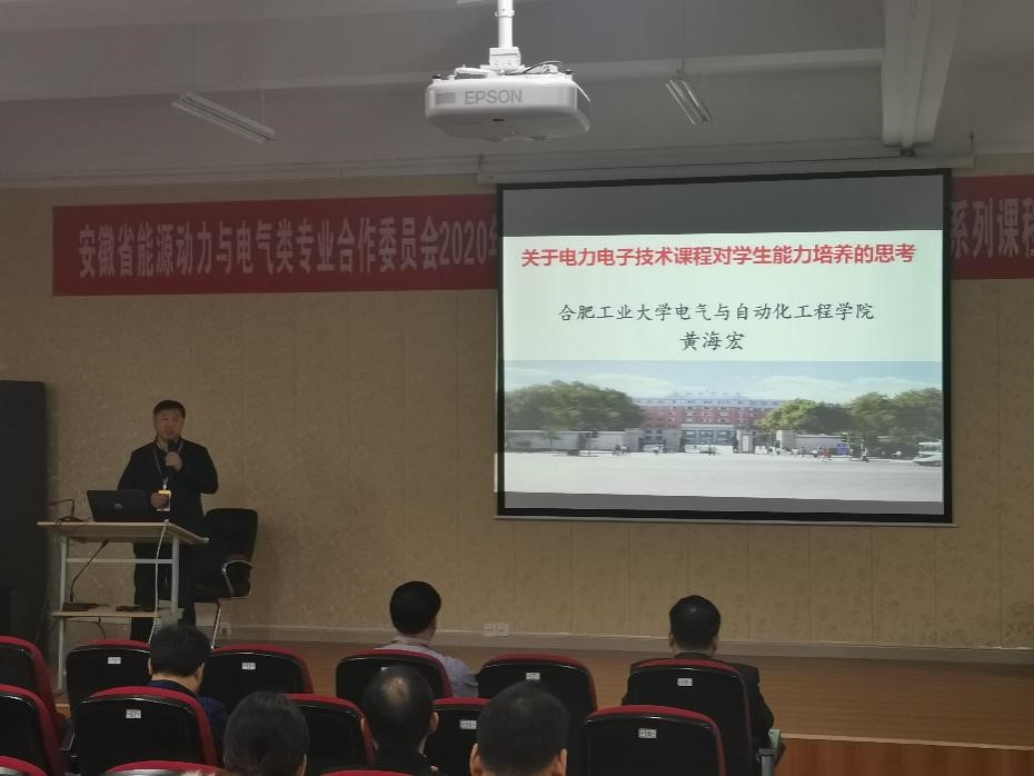 会议开幕式,合肥工业大学电气与自动化工程学院副院长黄海宏教授代表我院进行发言,欢迎参加会议的各位领导和老师并感谢全省兄弟高校对会议的支持。随后,在专题报告环节,我院张兴教授分享了光伏发电领域最新行业动态和前沿技术,展现了电力电子技术对社会进步的贡献;黄海宏副院长作了题为“关于电力电子技术课程对学生能力培养的思考”的报告,介绍了我院电力电子课程组在“电力电子技术”课程中使用的目的型教学方法。