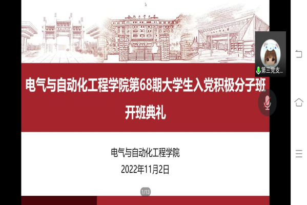 11月2日,电气与自动化工程学院分党校第68期大学生入党积极分子班开班典礼在线上举行,学院党委相关负责人、党校班主任以及学员班全体学员参加开班典礼。