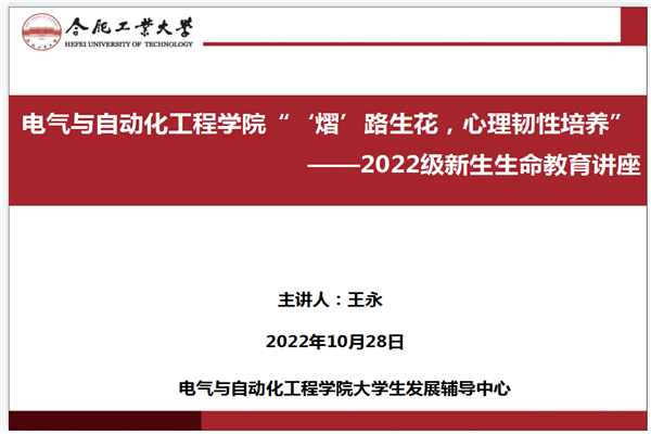 为帮助新生更好地开启大学生活,在疫情下认识生命的意义和价值,学会自我调适,培养积极健康的心态,10月28日晚,电气与自动化工程学院通过腾讯课堂平台学院开展“‘熠’路生花,心理韧性培养”新生生命教育讲座,活动邀请了合肥幼儿师范高等专科学校王永教授主讲,全体2022级本科新生聆听讲座。