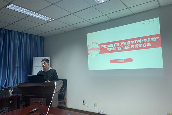 第二位分享者是李聪聪同学,他汇报的主题是:开放光路下基于宽度学习补偿模型的气体浓度在线实时测定方法。李聪聪同学建立TDLAS和BLS融合分析理论和技术体系,攻克吸收光程受干扰的红外光谱法性能退化的技术瓶颈,设计开放光路环境下光合速率的在线监测系统,采用云存储中心完成对海量的数据的存储,通过云存储服务平台将数据实时共享。李聪聪同学也和同学们仔细介绍了该设计中的算法流程,给各位同学打开了研究思路。