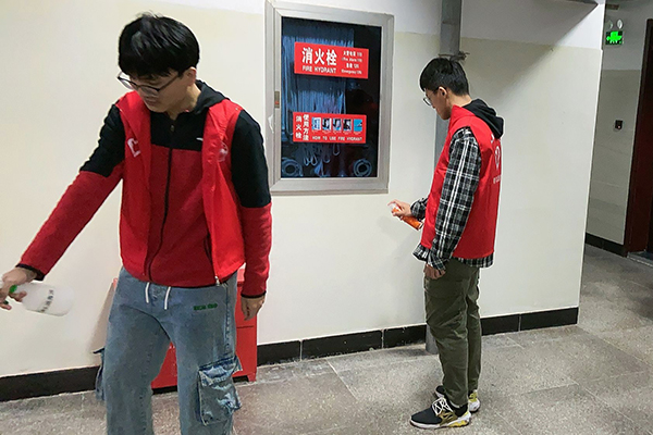 在活动开始后,志愿者们以极大的热情投入活动当中。他们在自己相应的楼层认真的进行消毒活动,在卫生工具及垃圾收理处进行多次消毒处理,绝不放过任何死角。在此次活动中,志愿者合理分工,不怕累,以实际行动诠释了“志愿”服务精神,展现了良好的风貌。