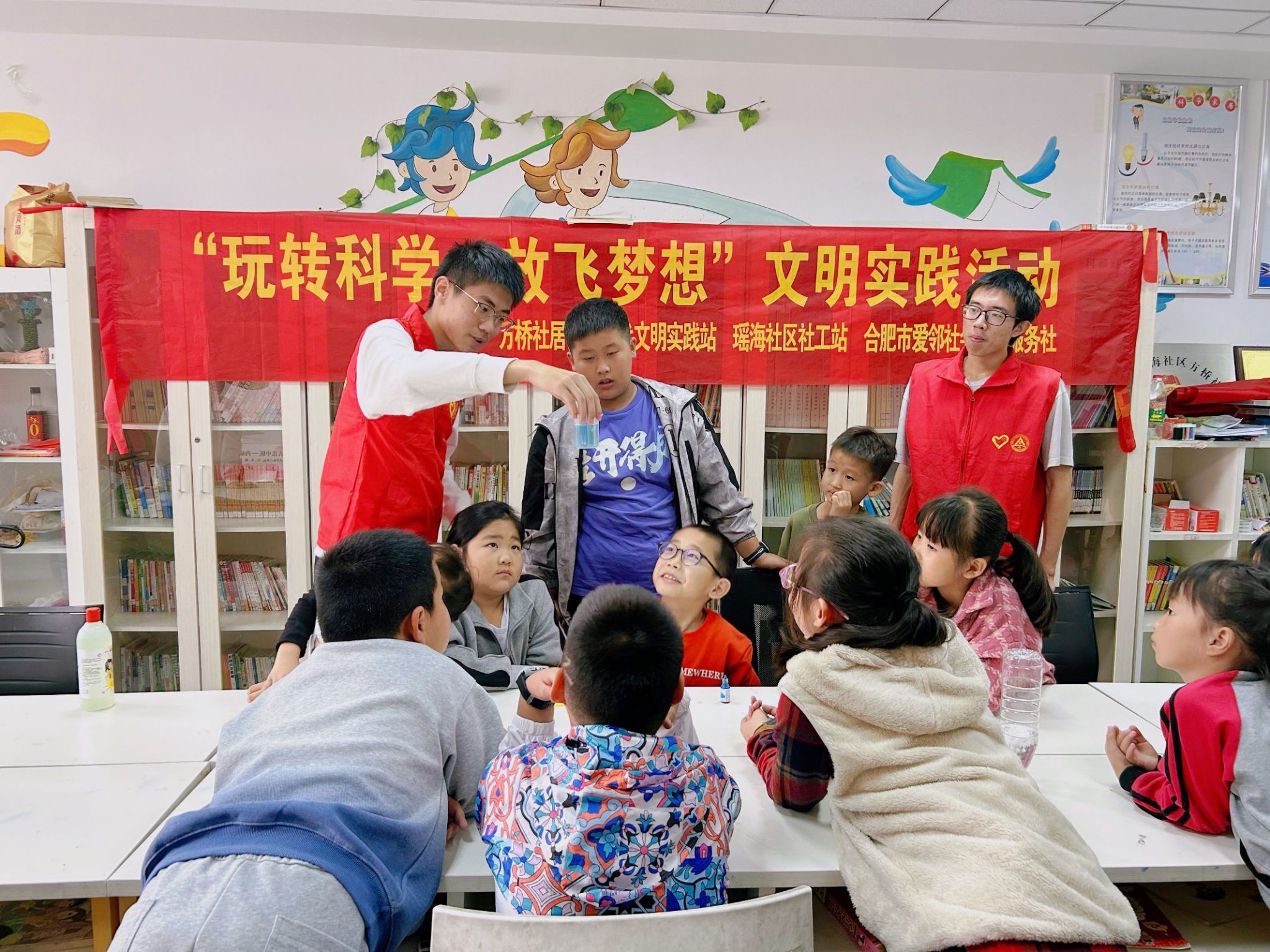 “熠”探究竟,科学实验。为点燃社区儿童探索求知热情,锻炼思考能力。志愿者前往方桥社区、香江社区、勤居苑等社区开展科学小实验活动。生活中处处都有科学,志愿者带领孩子们一起追寻摩擦生电的秘密,用化纤毛巾摩擦塑料吸管来展示电荷的异性相斥,一张纸在小朋友们的手里创造出不同的结构,从最开始只能支撑一个空瓶,到最后能撑起十本课外书。利用双面胶和瓶盖制作独属自己的万花筒……一场场别开生面的科学授课,犹如万花筒般展现各种科学知识,小朋友们积极参与其中,不断发现生活中的奇妙现象,用科学的思维去探索世界的奥妙!