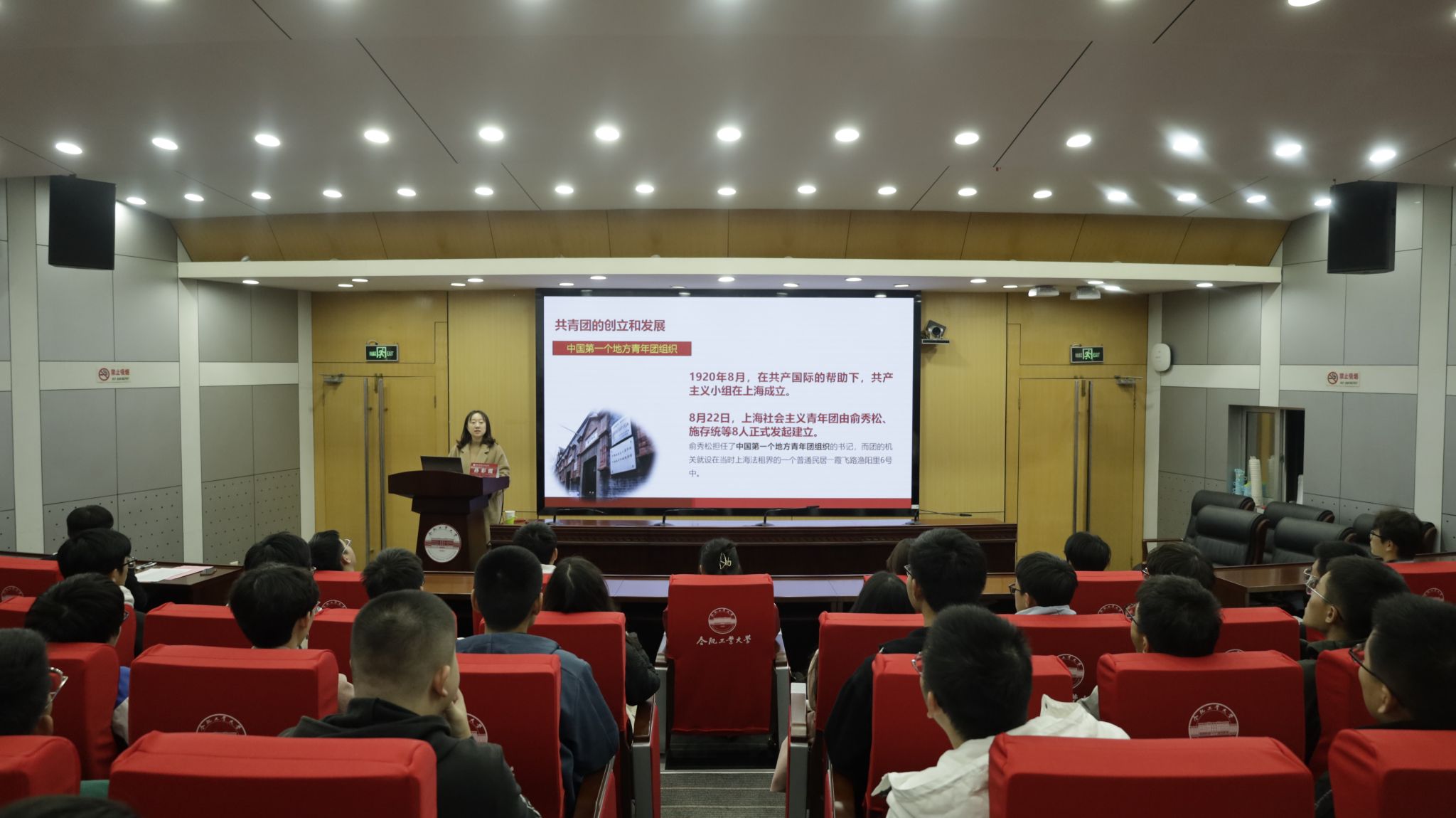 典礼结束后,校团委副书记孙彩霞为全体学员讲授题为《坚定不移听党话、跟党走,努力成长为新时代好青年》的主题团课。孙彩霞从共青团的创立、发展,初心、使命,争做新时代好青年三个维度入手,结合团组织的发展史和青年运动史生动阐释了共青团百余年来的历史沿革。团课中,她通过典型、赛事的列举,鼓励学员对标德智体美劳全面发展的榜样学习,面对丰富的活动要想参加、敢参加、爱参加,在一次次的参与中获得能力和体验的双向奔赴,立志做有理想、敢担当、能吃苦、肯奋斗的新时代好青年。