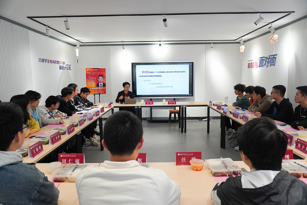 在愉悦放松的氛围中,文韬以“走出舒适区,培养‘四维’素养”为题展开分享。他结合学生学习生活实际,鼓励同学们要突破思维桎梏,打破传统观念,敢于走出舒适区,做自己“不情愿”的事;要培养精益求精的科研能力,建立起科研工作知识体系,根植研究领域的“房屋框架”,实践探索怎样“添砖加瓦”,多读、多听、多动手,将专业做“专”做“精”;要培养逻辑清晰的表达能力,学会换位思考,采用“面向对象”的方法论,站在对方视角看问题,面对不同的任务对象运用不同的表达技巧;要培养追求卓越的领导能力,把握实践锻炼的机会,提高专业技能和综合素养,勇于提出自身观点见解,学会时间管理,做敢于“吃亏”的实践者;要培养独具一格的创新能力,纠正创新与知识应用成果等价的错误认知,把握需求牵引,明确问题导向,拓宽基础研究的应用需求,探索学科间的交叉融合。