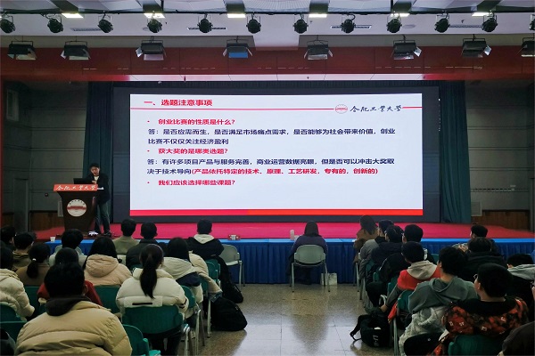 1月12日,电气与自动化工程学院2024年“挑战杯”大学生创业计划竞赛校内选拔动员暨“青·成长”创新创业赛事精解会在屯溪路校区东风报告厅举行。校团委创新发展部部长陈曾珍、校十佳大学生科技创新标兵苟艺辉受邀主讲,学院团委相关负责人和150余名学生参会。