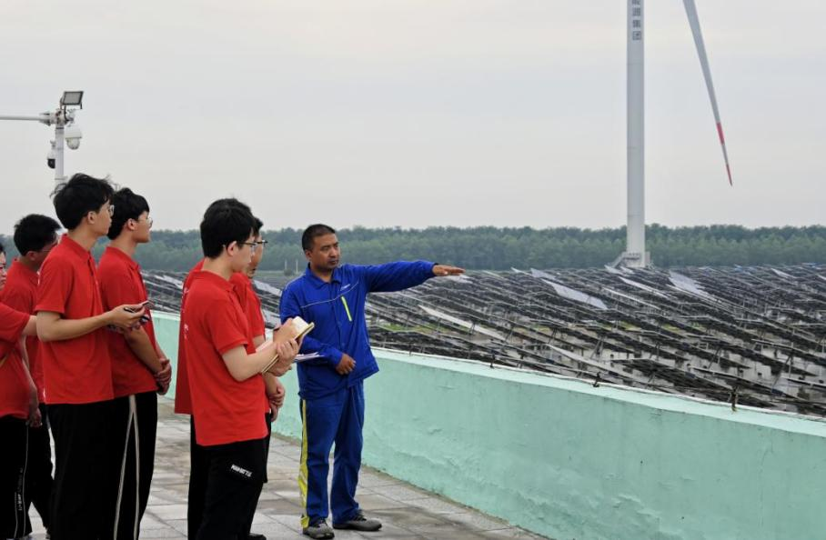 伴随电的旅途,感受光的温度。7月10日,调研团队前往中节能东台发电有限公司采访调研。绿水蓝天相映成趣,鱼群光板辉映成章,刚上屋顶,队员们就被眼前的“风光渔”斑彩画卷所震撼。迷人风光之下,隐藏着满满的“硬科技”。跟踪支架系统实现了光能利用“最大化”,渔光互补在养殖水产的同时利用水面光反射增加受光量,极大增加了土地利用效率。土地山水间,蕴藏着工程师的“一招一式”,团队成员真正感受到“创新”二字蕴藏的含金量。