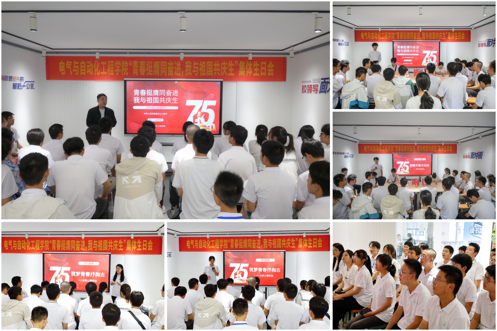 为庆祝新中国成立75周年,进一步激发广大学生热爱伟大祖国、勇担时代重任的热情,10月1日,电气与自动化工程学院于屯溪路校区七号学生公寓学生生活成长社区举行“青春挺膺同奋进,我与祖国共庆生”集体生日会,学院相关负责老师、40余名学生骨干汇聚在温馨的学生社区,以青春之名、以心中红星颂扬清澈的挚爱。