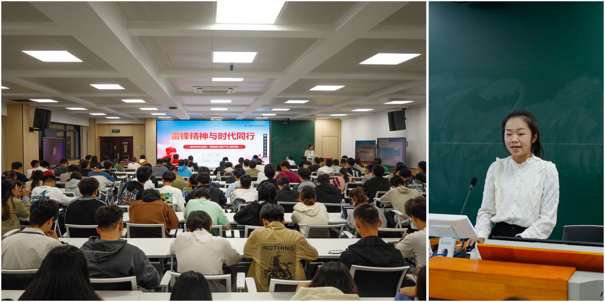 尹静以《雷锋精神与时代同行》为题,从耳熟能详的歌曲《学习雷锋好榜样》引入,通过列举雷锋同志的生平事迹重点解读了雷锋精神的深厚内涵,即热爱党、热爱祖国、热爱社会主义的崇高理想和坚定信念;服务人民、助人为乐的奉献精神;干一行爱一行、专一行精一行的敬业精神;锐意进取、自强不息的创新精神;艰苦奋斗、勤俭节约的创业精神。通过分享《雷锋日记》带学生体会了“一颗钉的学习精神”“一块砖的敬业精神”“一滴水的团结精神”“一团火的友善精神”和“一辈子的奉献精神”。在宣讲中她谈到,当今社会也有很多像雷锋一样掌舵希望、踏浪前行、影助人间的人。他们是医生,是军人,是教师,是环卫工人,他们以自己的人生续写着雷锋的故事。冀以尘雾之微,补益山海,荧烛末光,增辉日月。当无数“微尘”相互照顾,不停运转,燃起了新中国的万千明灯,得以万古永昼。我们无论走到哪里,无论在什么岗位,都要以青春的魂魄、激荡的心胸,创造如火如荼的事业,创造新美如画的生活。