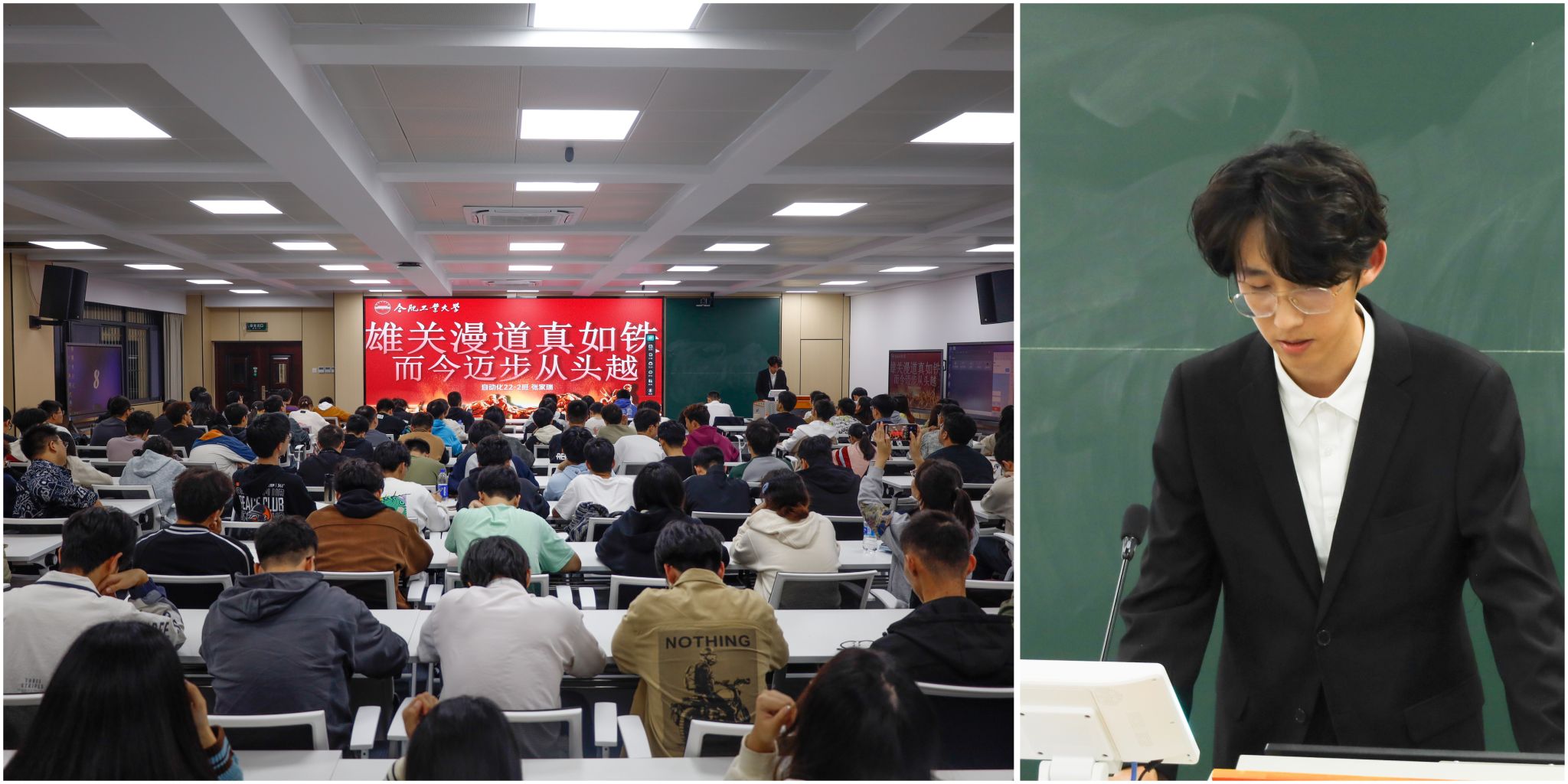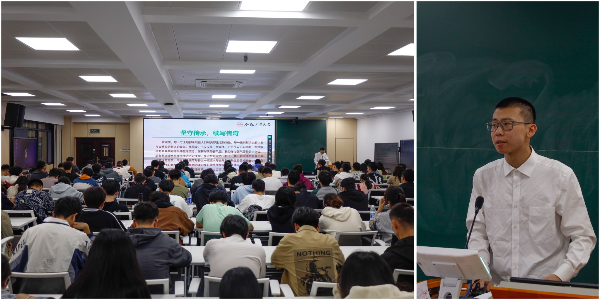 王张璟以《塞罕坝传奇》为题,围绕“沙暴肆虐,绿洲新生”“沙原点翠,梦想起航”“林海归来,夫妻守望”“三代见证,再创奇迹”“坝上传奇,辉煌再续”“使命传承,精神延续”等方面向学生讲述了“牢记使命”“艰苦创业”“绿色发展”的塞罕坝精神。他谈到,半个世纪前的塞罕坝条件艰苦、风沙漫天,但共产党人用顽强的信念和坚定的脚步,让塞罕坝“从无到有”“自有为繁”。在这里,无数青年燃烧着自己的青春激情,他们踔厉奋发,勇毅前行,在这片曾经的荒漠上播撒希望的种子,自信自强地书写着属于自己的绿色篇章。他们与国家同呼吸、与人民共命运,用实际行动证明,青春奋斗的每一步都将汇聚成改变世界的强大力量。我们作为朝气蓬勃的大学生,肩负着延续塞罕坝精神的历史使命。在这片希望的田野上,我们将继续书写属于我们的绿色篇章,用青春的画笔勾勒出一幅幅人与自然和谐共生的美好画卷。让绿色成为时代的底色,让生态文明的理念在心间生根发芽,茁壮成长!