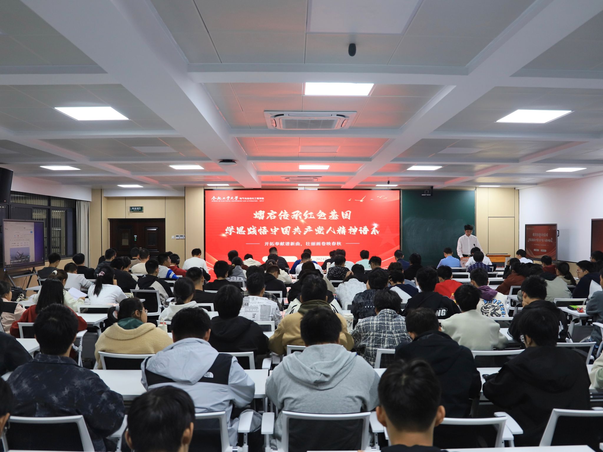 11月18日,电气与自动化工程学院于逸夫楼1005会议室开展“开拓奉献谱新曲,壮丽画卷映春秋”主题宣讲,学院“熠启传承红色基因、学思践悟中国共产党人精神谱系”宣讲团成员李佳峻、杨行行、章贝兆、朱国庆深情讲述了脱贫攻坚精神、五四精神、北大荒精神、兵团精神,学院相关负责老师、团学组织负责人、电气工程及其自动化专业2024级学生参加学习。