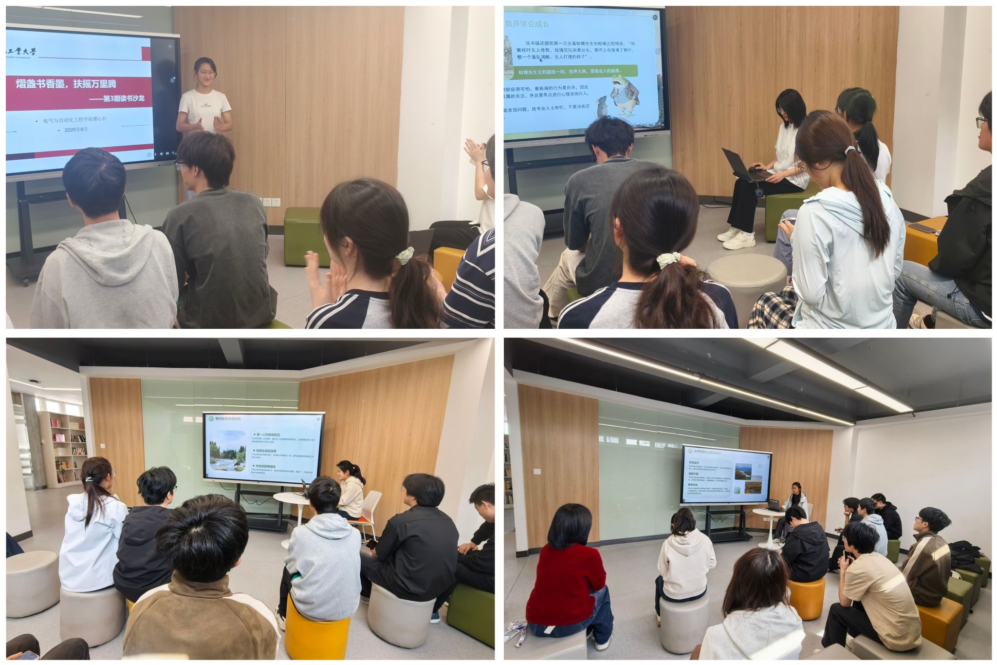 2025年5月至6月,电气与自动化工程学院在屯溪路校区5号楼学生生活成长社区沙龙空间组织开展“熠展书香墨,扶摇万里腾”系列主题读书分享会。