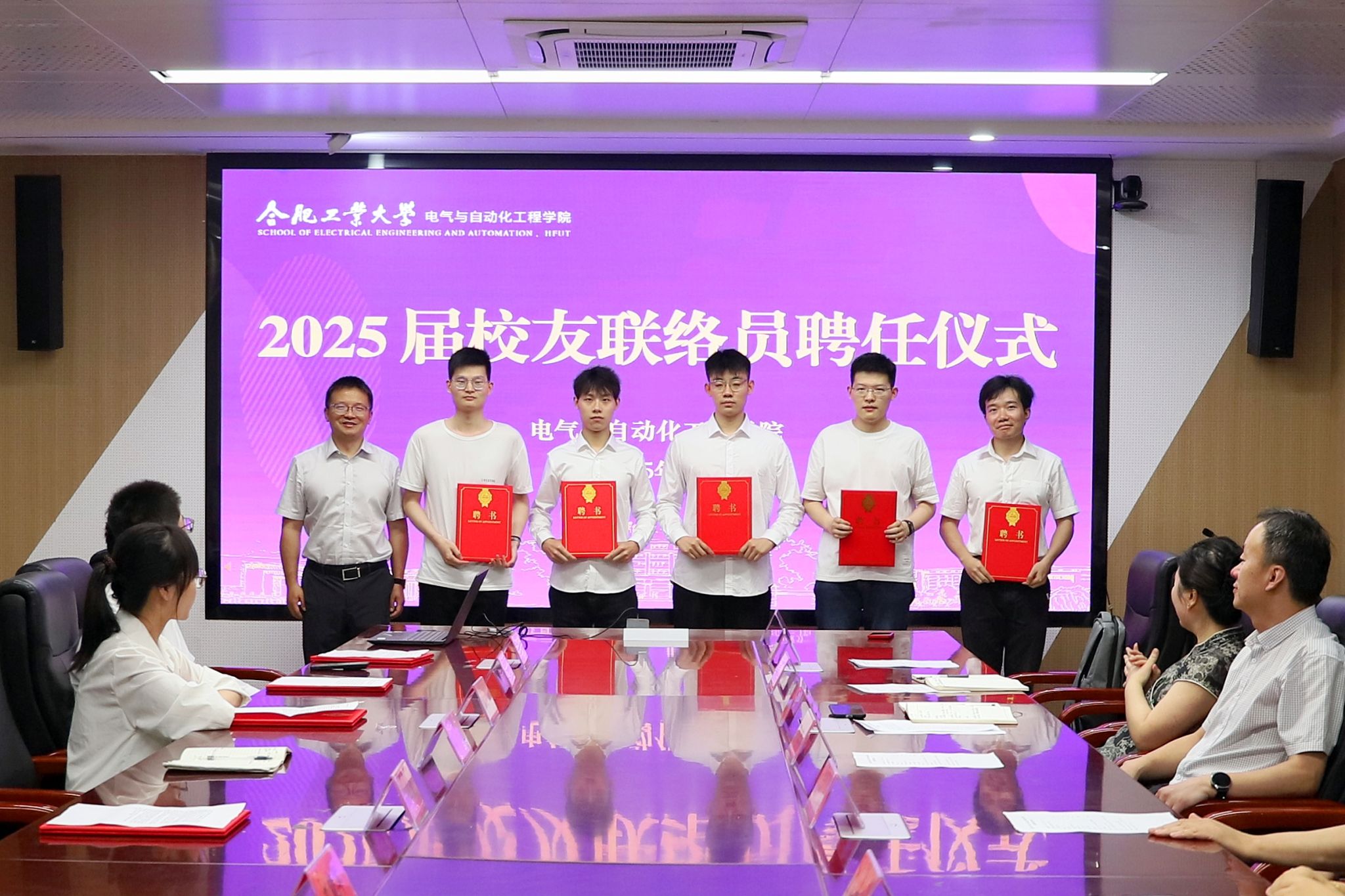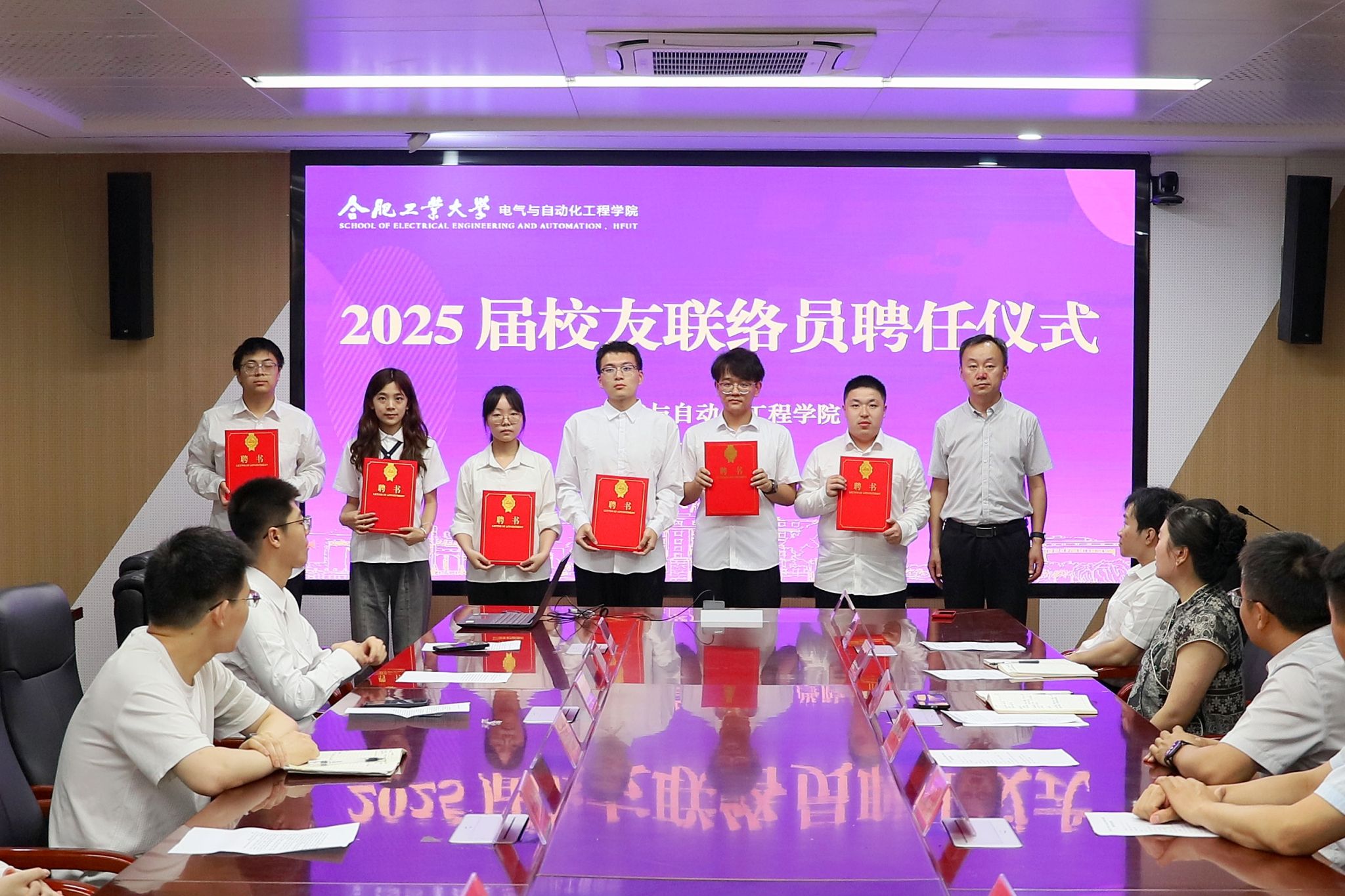 6月12日,电气与自动化工程学院于逸夫楼1009会议室举行2025届校友联络员聘任仪式,学院党委书记冯航、院长向念文、学院党委副书记兼纪委书记张栋、毕业班辅导员、各班级受聘校友联络员参加仪式。